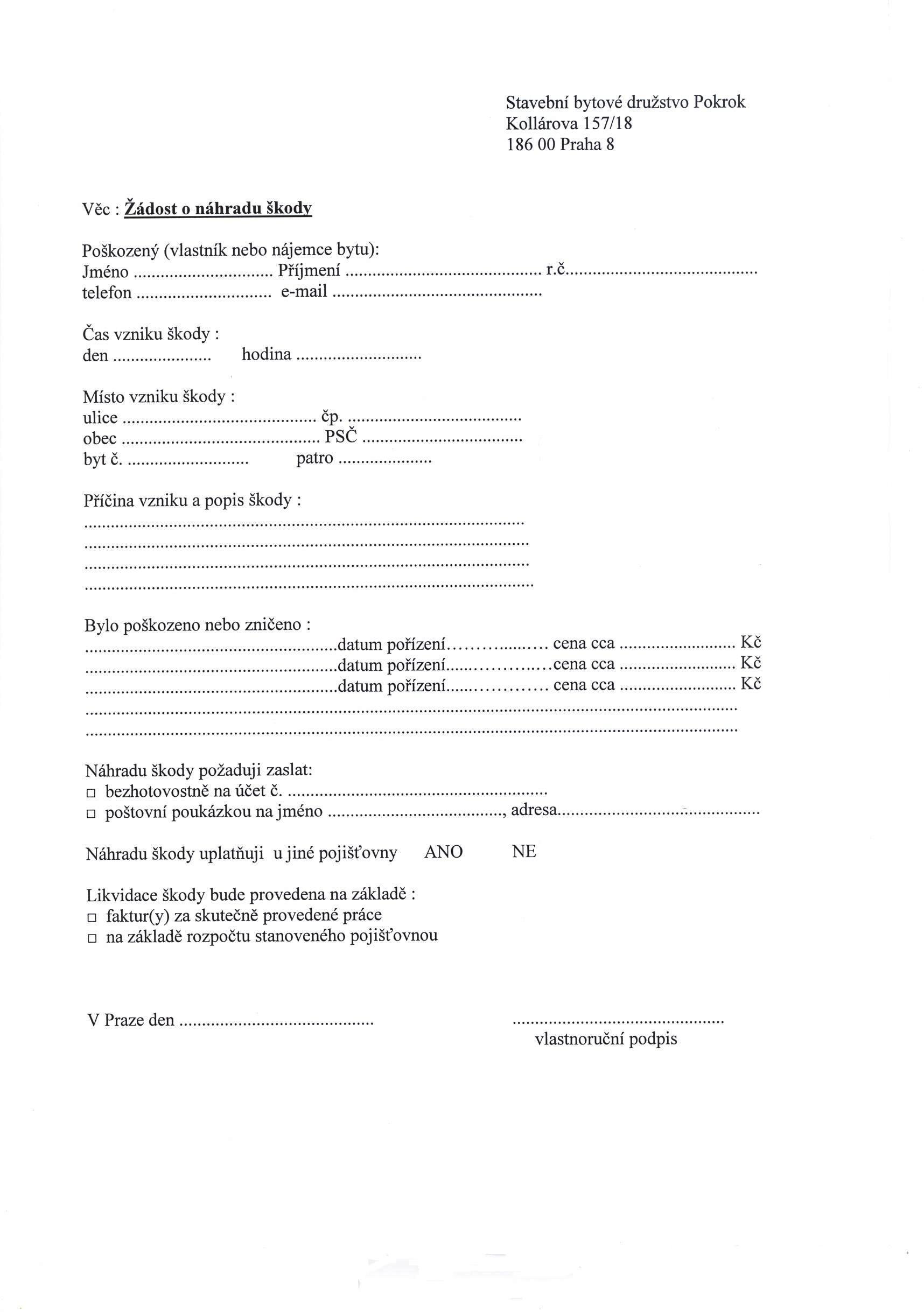 Formulář - žádost o náhradu škody